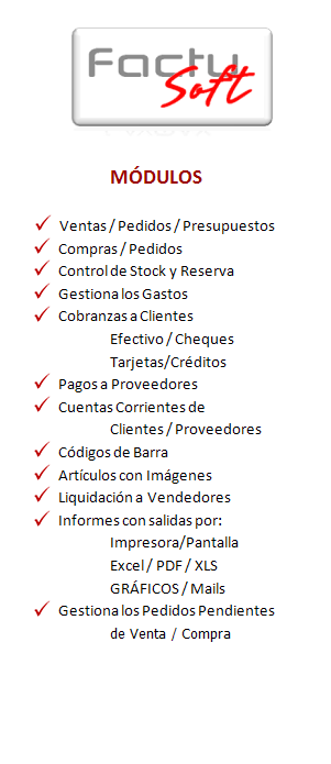 El Sistema FactuSoft, está en el mercado desde el año 2010, basado en la plataforma del Sistema de Gestión SayMax®, siendo el producto final luego de 1 año de diseño y programación de nuestro experimentado equipo de trabajo, con el objetivo de poder satisfacer a nuestros Clientes con menos recursos económicos, y que deseen obtener un Sistema Empresarial. Es aplicable a dos distintos tipos de Implementación según la necesidad de su Compañía: a). Para un Negocio. (Ideal para Locales de Venta a la calle con un solo puesto de trabajo). b). Para Empresas que poseen varias Terminales.